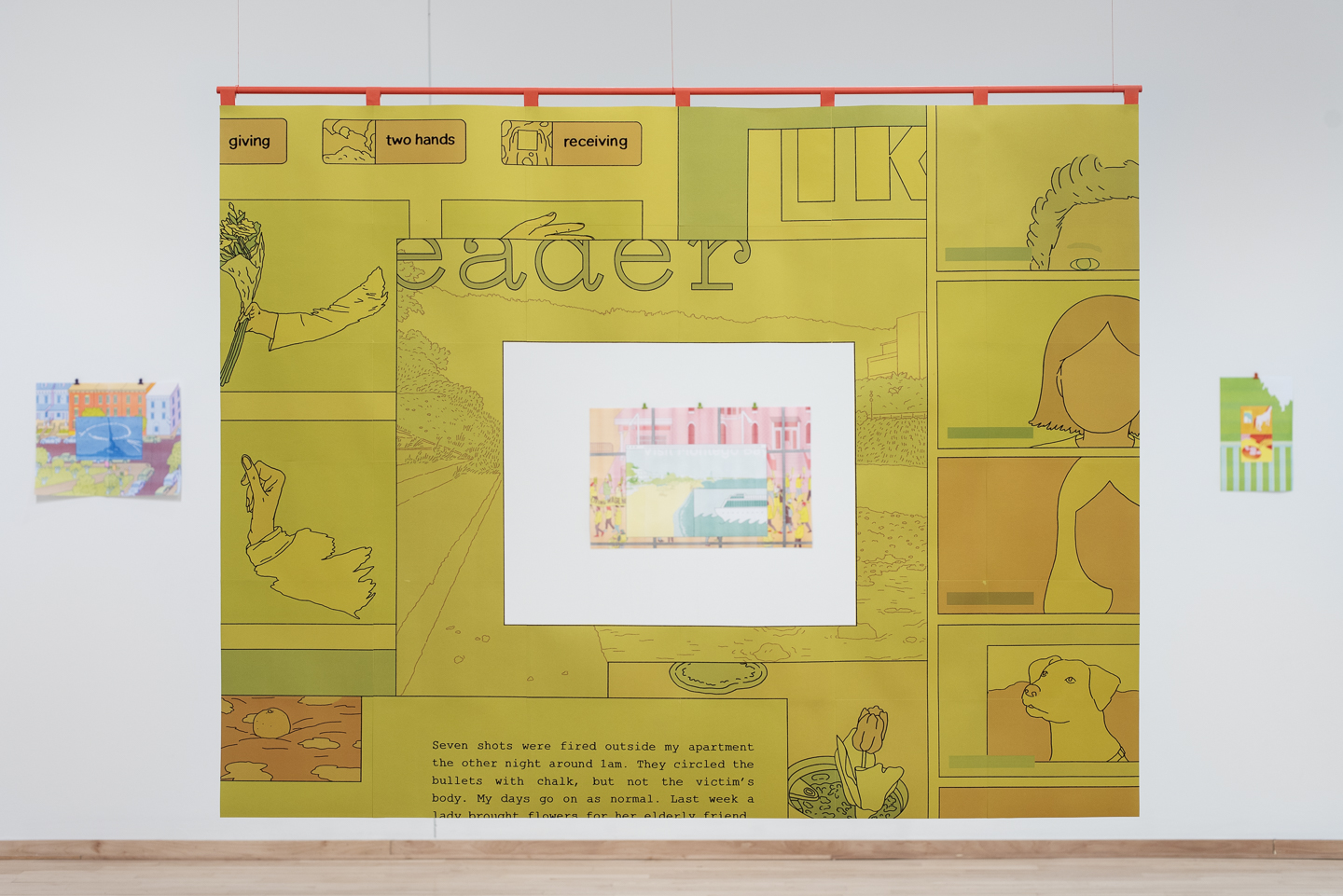 This body of work approaches the contemporary experience of multi-locatedness through illustrated observations of people’s behavior in the built environment. Many of the scenes depicted in this work are seen from an omniscient perspective, often referred to as a god’s-eye-view. This viewpoint implies distance and control, yet the scenes themselves are direct, personal encounters from the artist’s life. What do you see when you look at looking? Whose perspective do you inhabit? How do we locate ourselves when we can be everywhere?